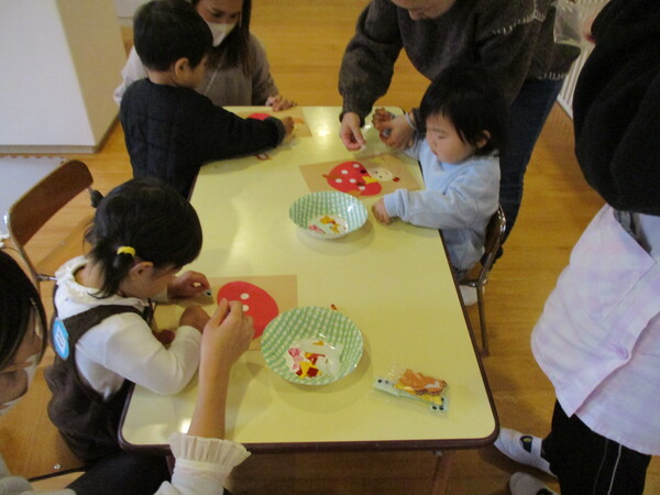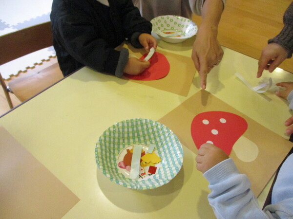 今日は「きのこ製作」をしました! きのこのかさに丸シールをペタペタと貼り、模様をつけました。 画用紙の落ち葉やイチョウは好きなところに貼りました!落ち葉が降ってきたように貼っているお友達もいましたね。 そのあとは短く切ったすずらんテープで遊びました! 細く裂いてみたり、舞い上げてとヒラヒラ〜っと落ちてくる様子に大はしゃぎのお友達でした! 次回は11月19日(水)にトトロのリース製作をします! 11月の予約はこちらから。12月の予約はこちらから。ご参加お待ちしております😊 |