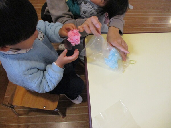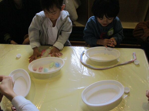 今日は軽量樹脂粘土と水・重曹スプレーを使って、スライムを作りました! 粘土のスライムはもちもちしてのび〜る感触に夢中になって遊んでいましたね! 赤・青・黄の三原色のスライムを作った後には、それぞれの色を混ぜてみました。 「赤と青を混ぜると...?」「あ!むらさきになった!」と2色のマーブル模様から色が変わる様子も楽しみました😊 おうちでもぜひ遊んでみてね! 次回は11月18日(火)に袋で魚を製作した後に魚つりをします🎣 11月のご予約はこちらから。12月のご予約はこちらから。ご参加お待ちしております♡ |