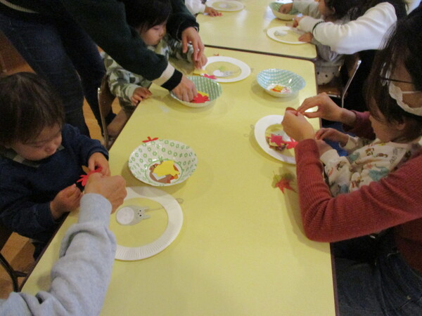 今日はまずイチョウや紅葉の観察をしました。 葉っぱの形や色に興味津々のお友達でしたね! 製作ではさっき観察したイチョウや紅葉の形をした画用紙やトトロ・まっくろくろすけをリースに貼りました! トトロを見て、♪さんぽを口ずさんでいるお友達もいましたね! そのあとは新聞紙あそびをしました! 新聞紙を丸めたりちぎったり、新聞紙のシャワーには大はしゃぎの様子でした! 次回は11月26日(水)に少し早いクリスマス製作をします。 11月の予約はこちらから。12月の予約はこちらから。ぜひご参加ください♡ |