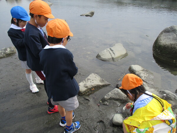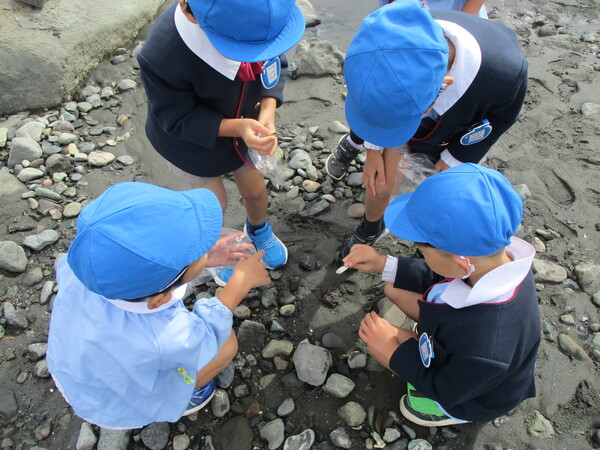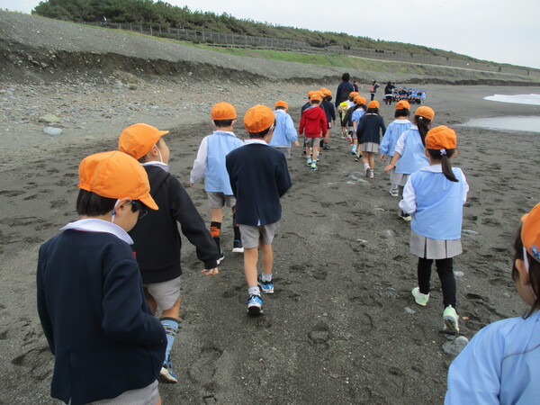 昨日は年長2クラスで海までお散歩に行きました! この前学んだ交通ルールを守りながら、お友達と手をつないで歩きました。 海に着くと、「きれいな貝がある!」「これ何の骨?」など海に落ちてるものに興味津々の子どもたちでした! 帰るころには袋いっぱいの貝殻をお土産に持って帰りました😊 往復で約1時間!一生懸命歩いた年長さんでした! |