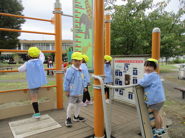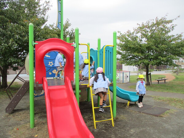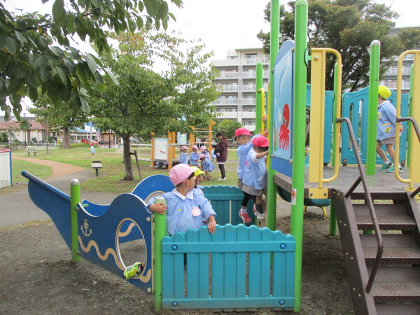 今日は年少・年中組の3クラスで幼稚園から近い「しろやま公園」まで歩いていきました! 公園に着くとそれぞれ好きな遊具で遊び、大はしゃぎのお友達でした! またみんなでお散歩に行こうね! |