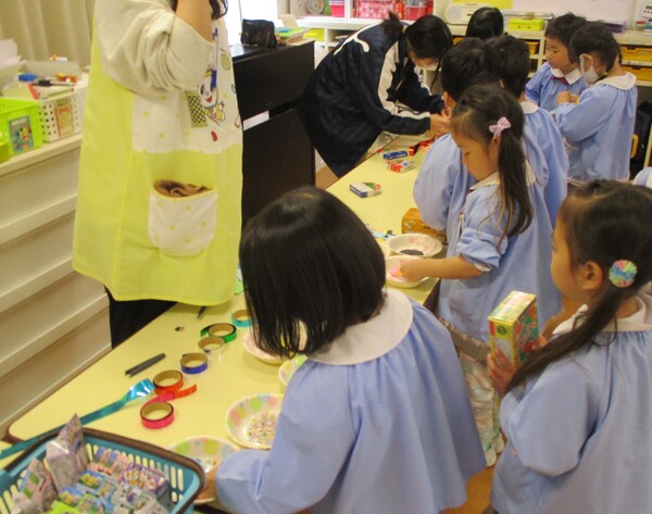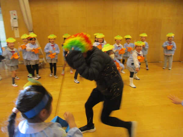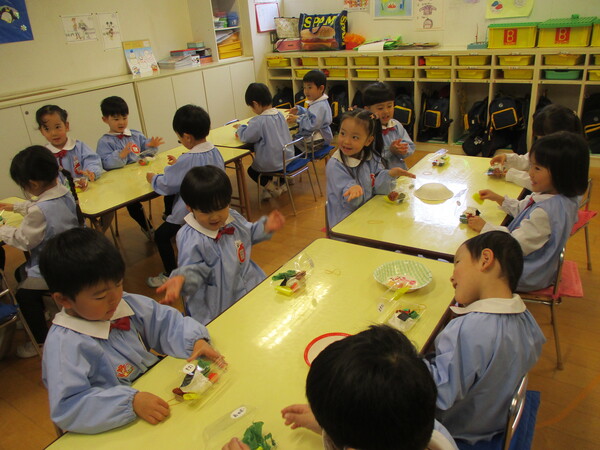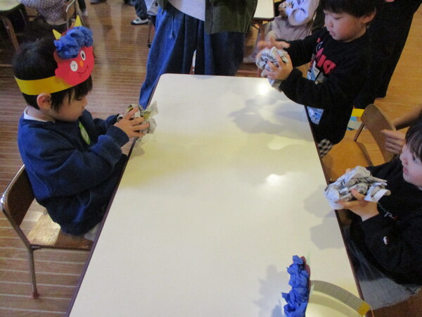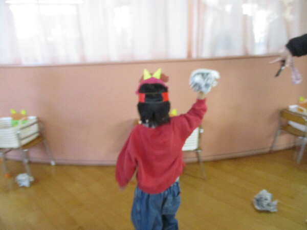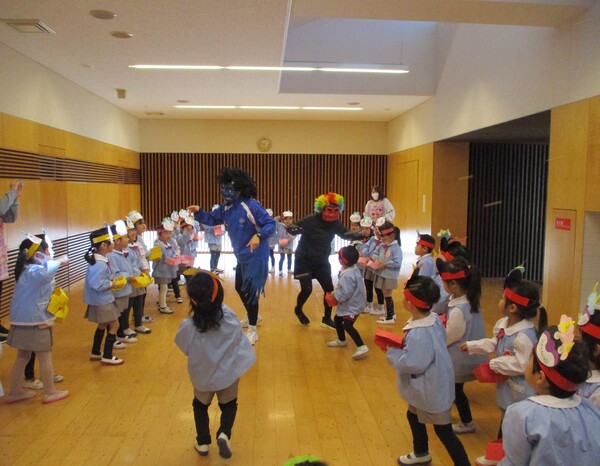 今日はホールに集まり、みんなで豆まきをしました! 鬼にめがけ、「鬼は外ー!!福は内ー!!」と一生懸命投げていましたね。 鬼もみんなの迫力にびっくり!無事に鬼を退治することができました。 みんなの心の中にいる色々な鬼もいなくなったかな? 作ったお面と豆箱でおうちでも豆まきをやってみてね! |