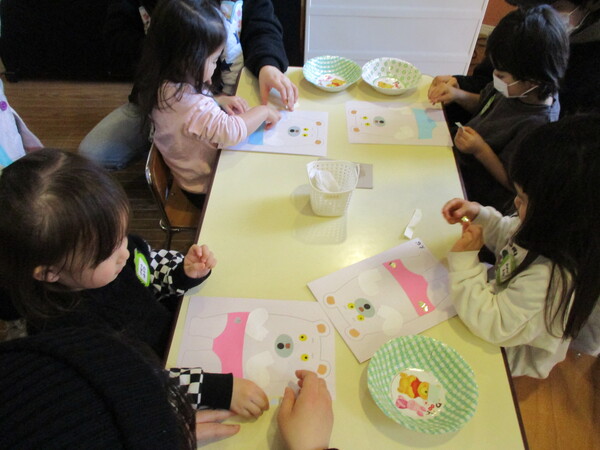 今日は節分にちなみ、「つのつのつーの」の遊び歌をしました! 子どもたちはもちろん保護者の方も思わずハマってしまうメロディでしたね😊 鬼のお面作りでは、前回に引き続き「のり」を使いました! お母さん指に、少しずつのりを付けて貼っていましたね! そのあとは新聞紙を丸めてボール(豆)を作り、鬼に向かって投げました! 「おには〜そと!」と投げて、無事に鬼を退治することができました! おうちでも豆まきをやってみてね👹 次回は2月10日(火)に「しろくまのパンツ」製作をします。 ご予約はこちらから。ぜひご参加ください♡ |