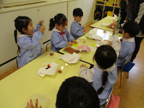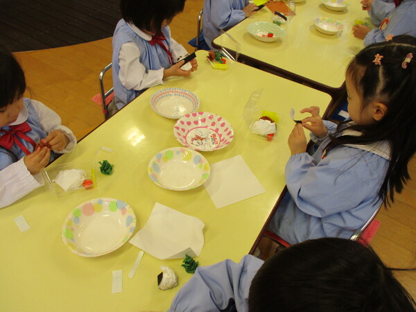 先週の年少組さんでは、おべんとう製作をしました。 折り紙でおにぎりを作って画用紙の海苔を巻いて、本物そっくりのおにぎりに! いろいろなおかずを作りプラ容器に詰めると、嬉しそうに完成したおべんとうを見せてくれたお友達でした! |