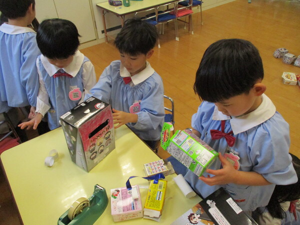 先週の年中さんは、空き箱製作をしました! 空き箱に廃材や画用紙、ミラーテープなど使いたいものを選んで製作しました! 作りたいものはあるけどどうしたらいいのかな…と初めは戸惑う姿もありましたが、 先生に聞いてアドバイスをもらったり、お友達のやり方をまねながら楽しく製作をする姿がありました! 郵便ポストやカメラ・バッグなどそれぞれ好きなものをたくさん作ったお友達でした! |