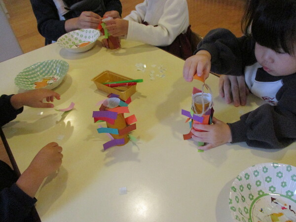 まずは色々な葉っぱを観察しました。 大きい葉っぱに小さい葉っぱ、緑や赤・茶色の葉っぱなど色の違いにも注目しました。 お外に出たときにも色々な葉っぱを探してみてね! そして今日はみのむし製作をしました! トイレットペーパーの芯に画用紙をペタペタと貼り付けて、みのむしにお洋服を着せました! きっちり並べて貼るお友達、画用紙をつなげて長く貼るお友達、横向きに貼り重ねるお友達…と 材料は同じでも貼り方に個性が出ていましたね! 次回は11月11日にのび〜るスライムを作って感触遊びをしたいと思います! 11月の予約はこちらから。12月の予約も本日からできます(こちらから)ご参加お待ちしております😊 |